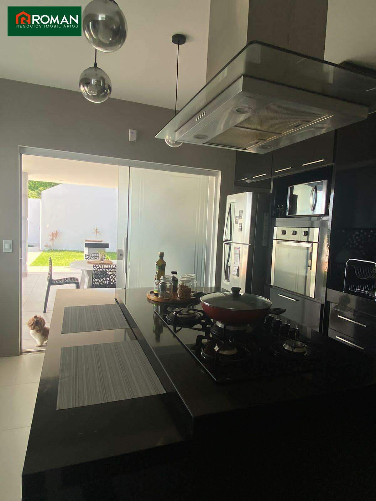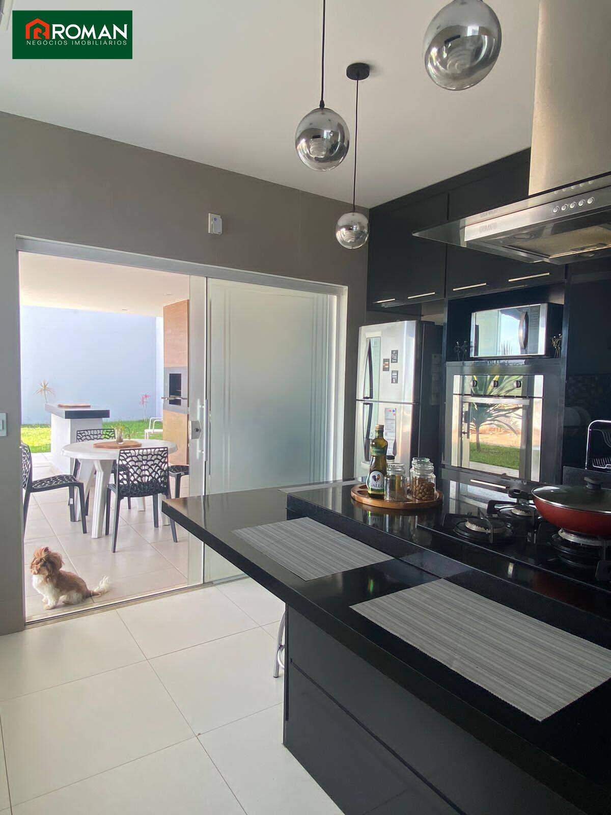 área externa com churrasqueira, banheiro e vaga para três veículos.
